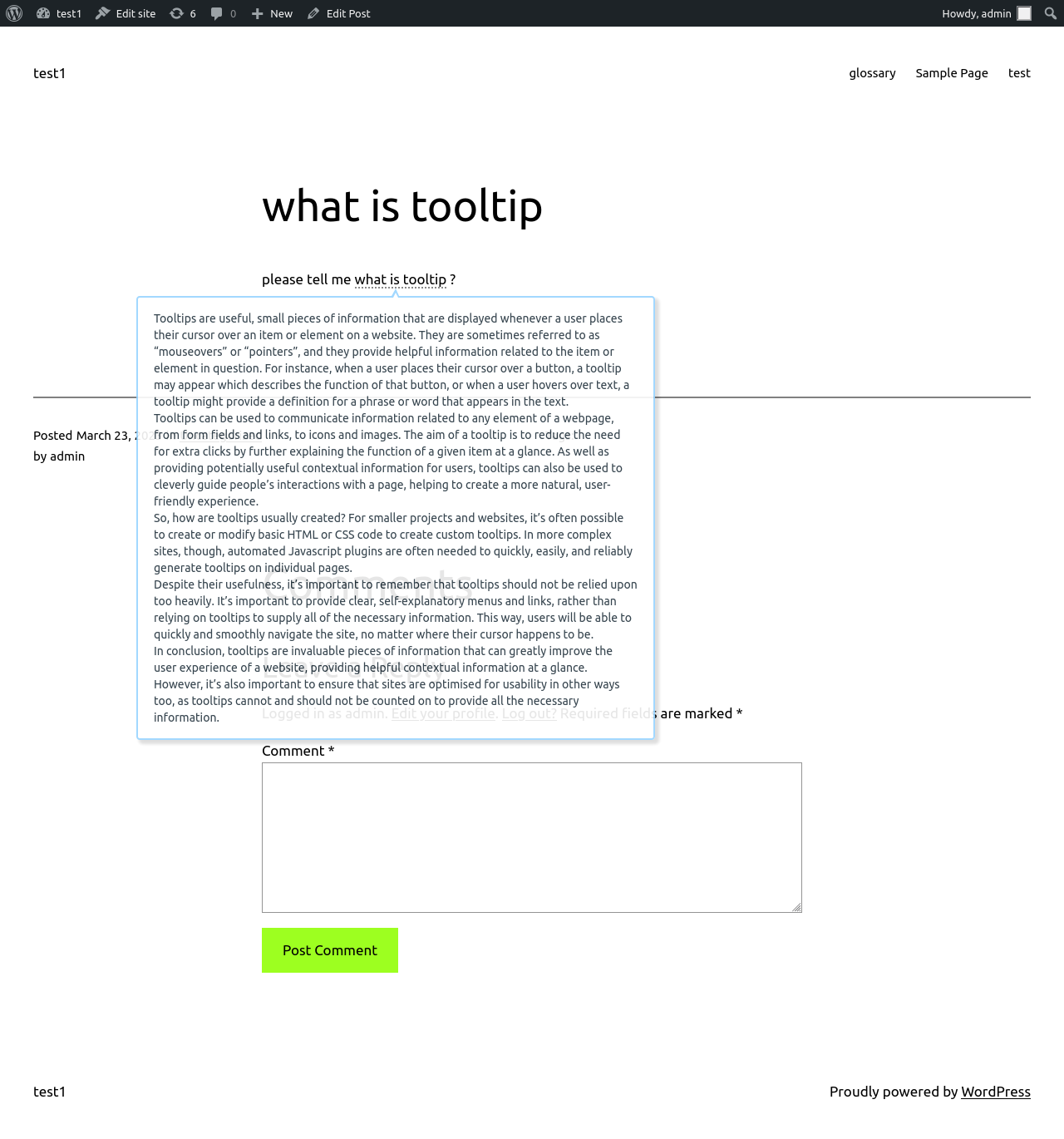 we will use the title of the post as the keyword of your tooltips, and use the content of the post as the content of your tooltips, for example: If you use “wordpress” as post title, and use “we love wordpress” as the post content, when users view your post, they will find the word “wordpress” with a dotted line under it, and when user move over the word “wordpress”, the tooltip box will popup and show the tooltip content “we love wordpress”
