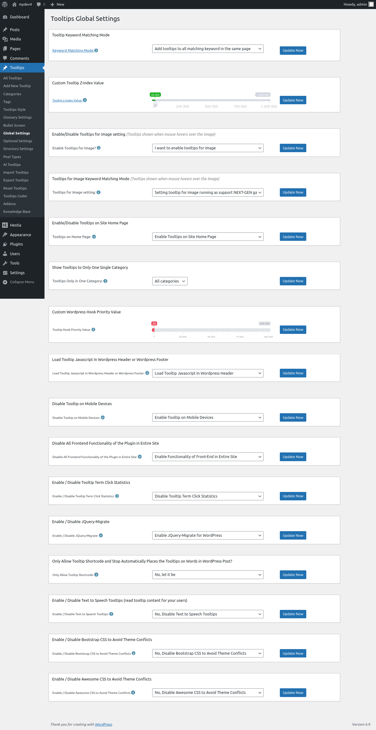 3: You can setting your tooltips in Tooltips Global Settings page at admin area, for example you can choose ” Add tooltips to all matching keyword in the same page ” or ” Add tooltips to the first matching keyword in the same page” and so on