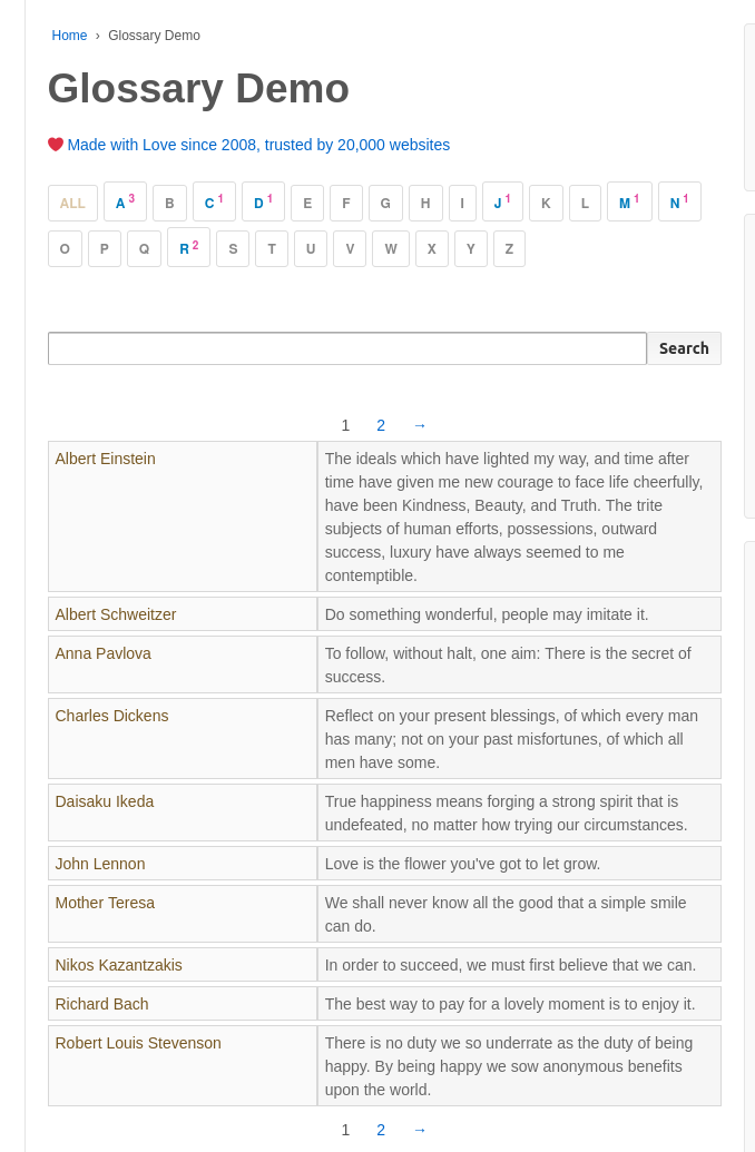 Supports key-value glossary styles, stacked list style, Bootstrap glossary, and 50+ customization options.