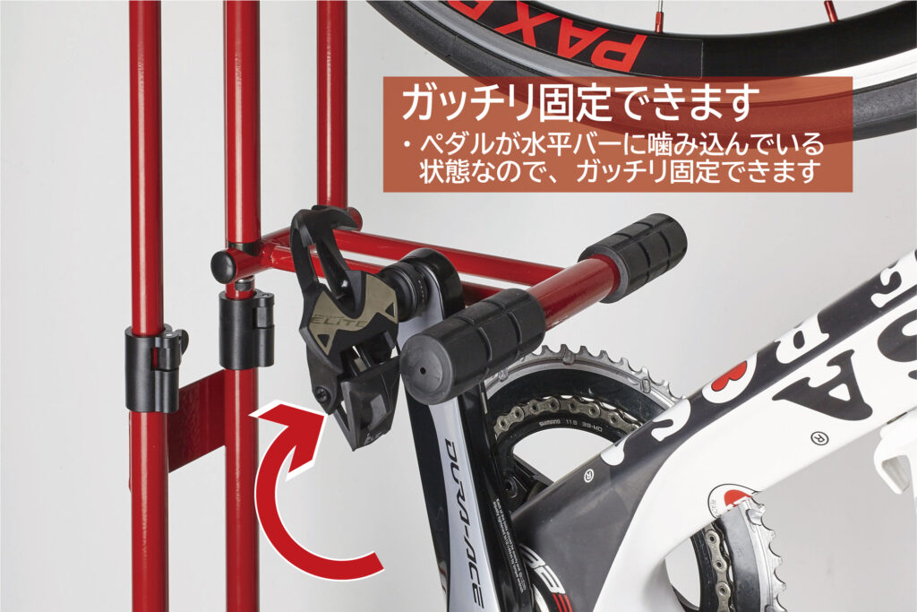 ペダルが水平バーに噛み込んでいる状態なので、ガッチリ固定できます