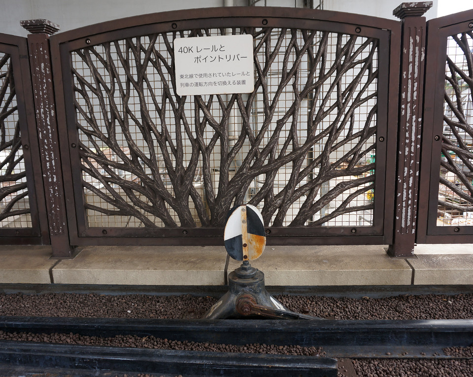 東北線のレールとポイントリバー(線路の方向を切り替える装置)と、鉄道関連の渋いものが展示されています。
