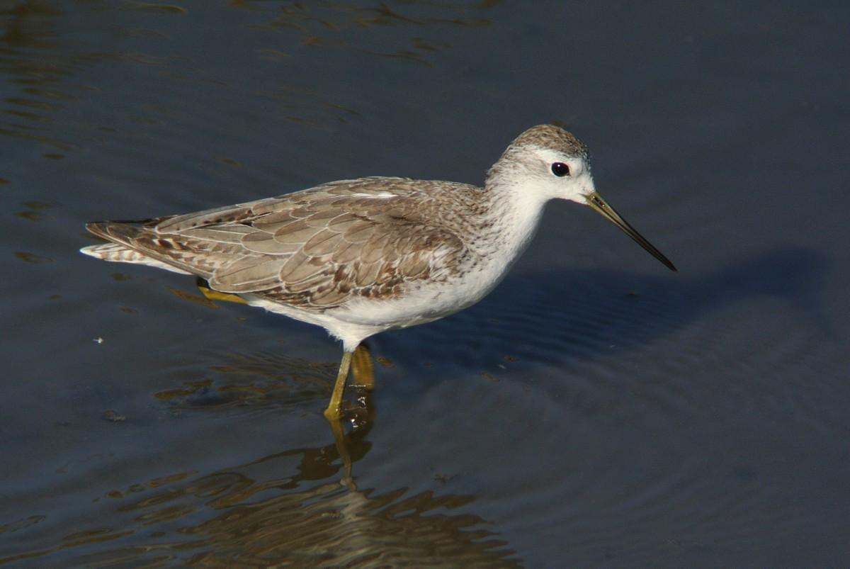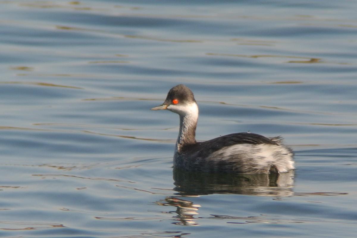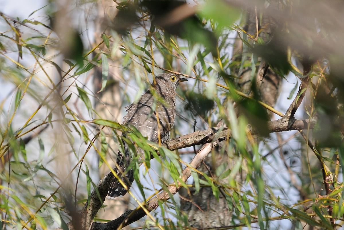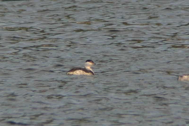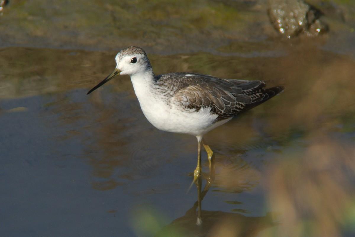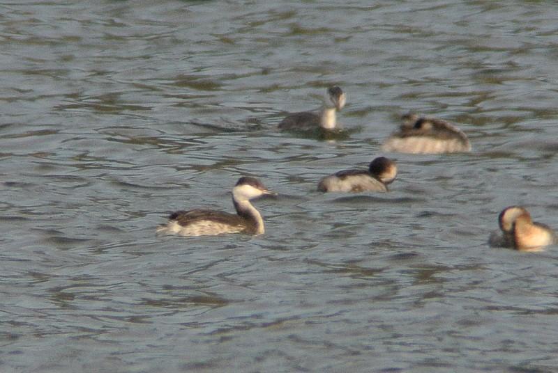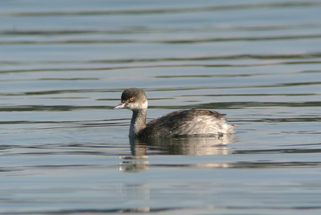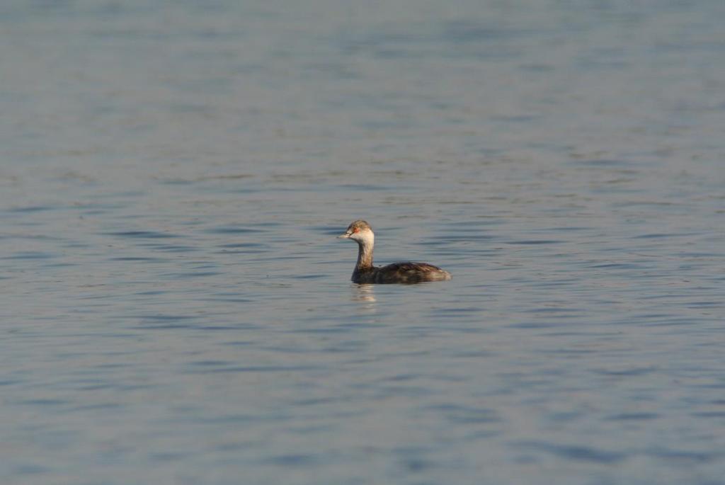 この時間帯、混群がやって来て、水浴びを始めますので、久しぶりに、その姿を狙っていたのですが、いつも居るカルガモの群れの中に、見慣れない鳥が居ます。