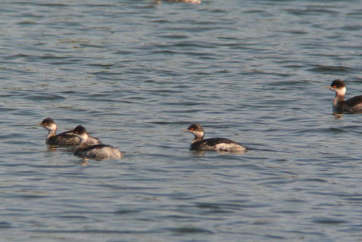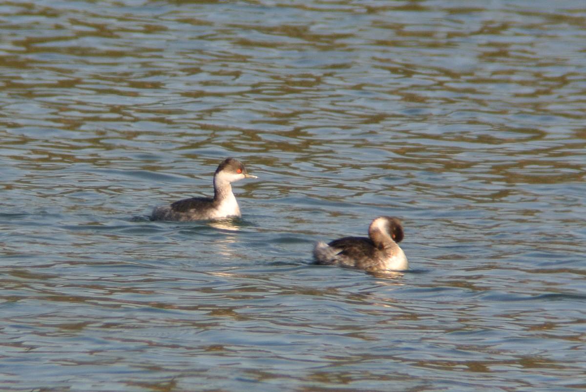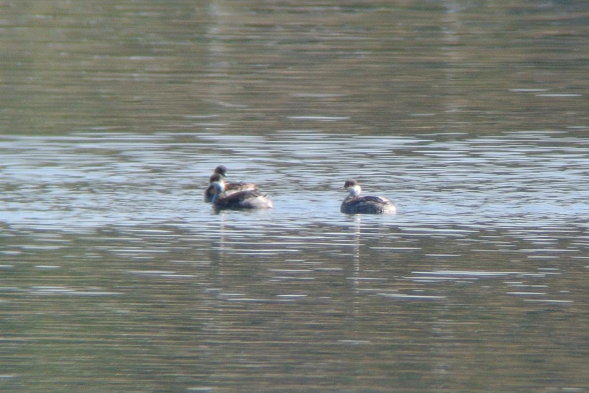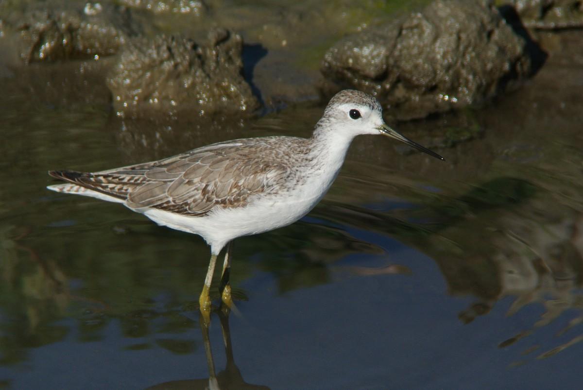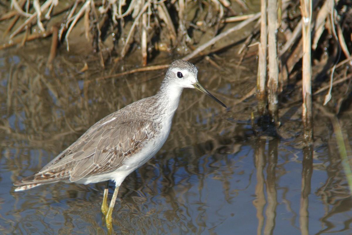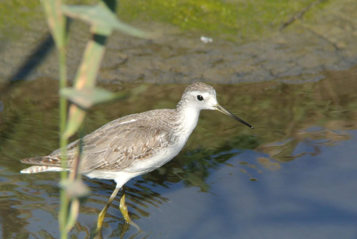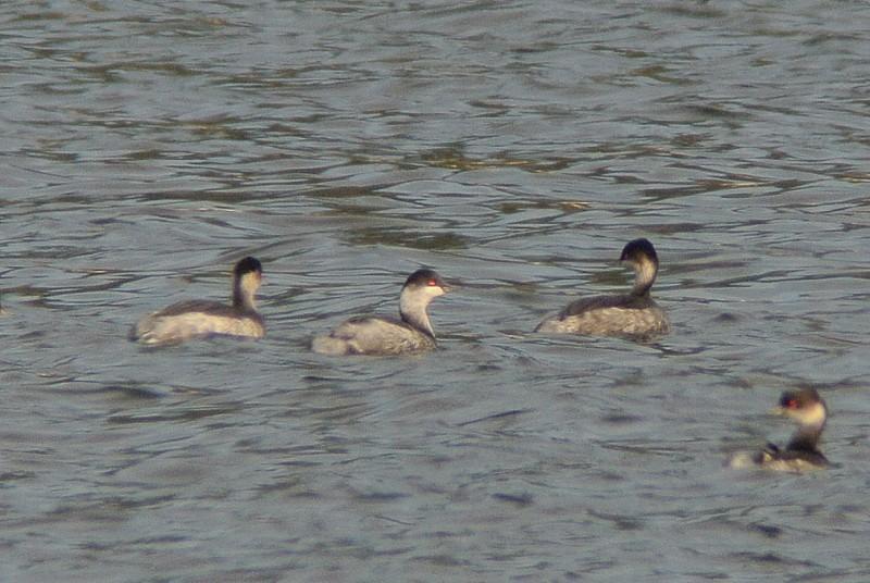 この時間帯、混群がやって来て、水浴びを始めますので、久しぶりに、その姿を狙っていたのですが、いつも居るカルガモの群れの中に、見慣れない鳥が居ます。