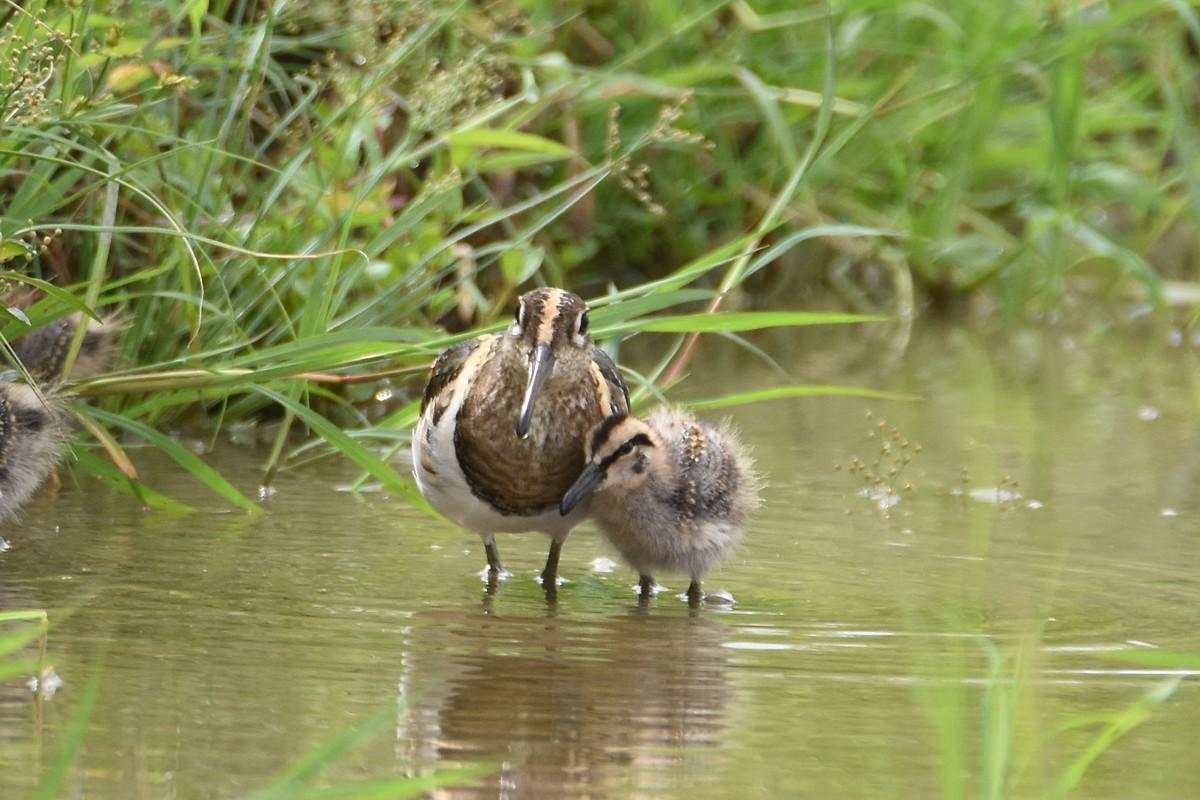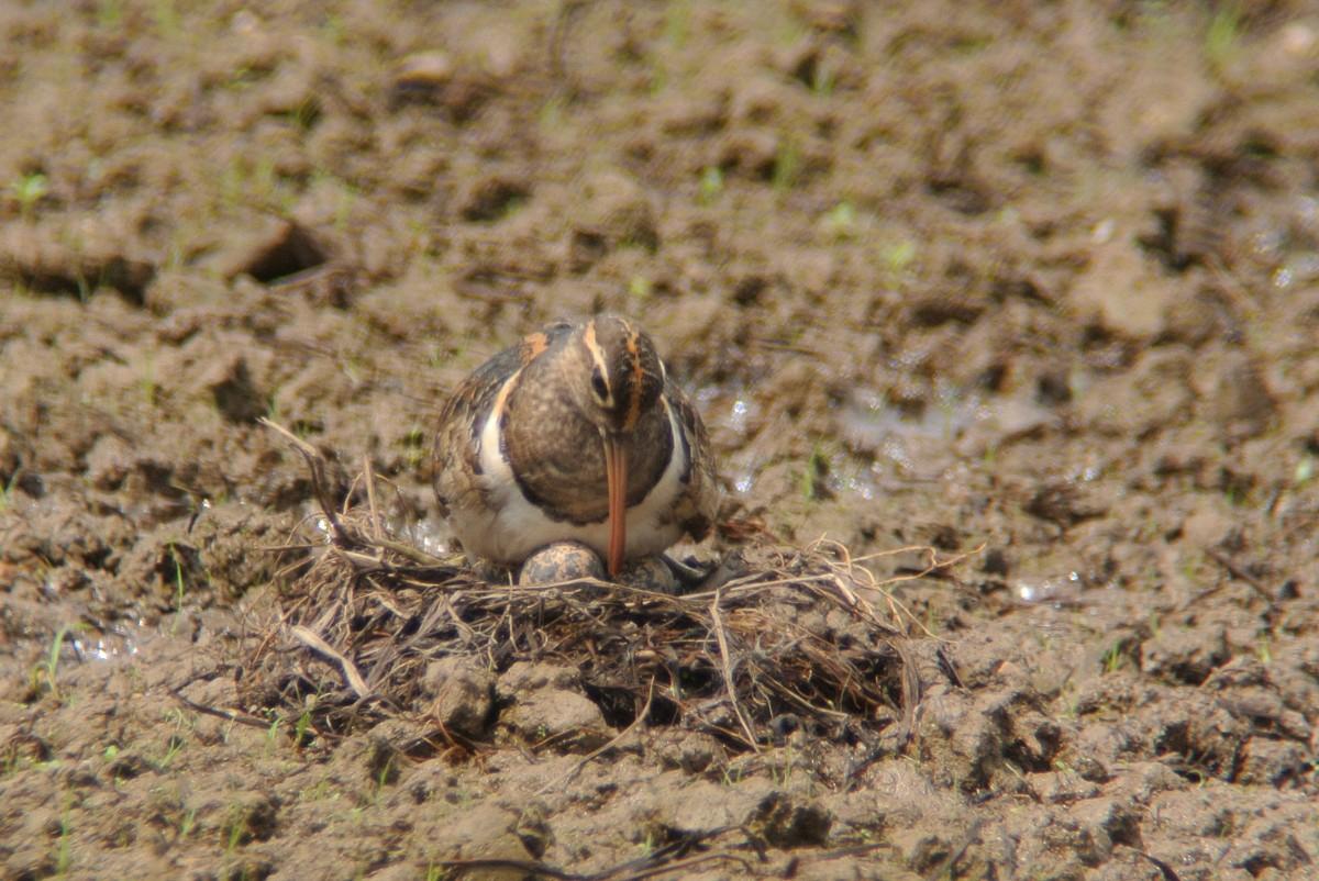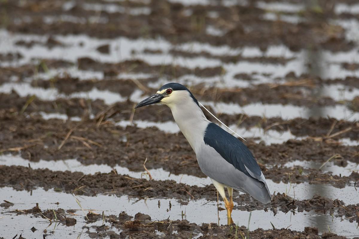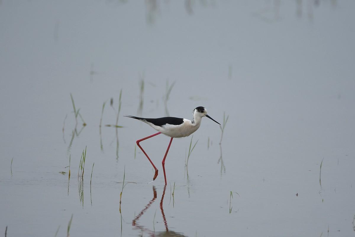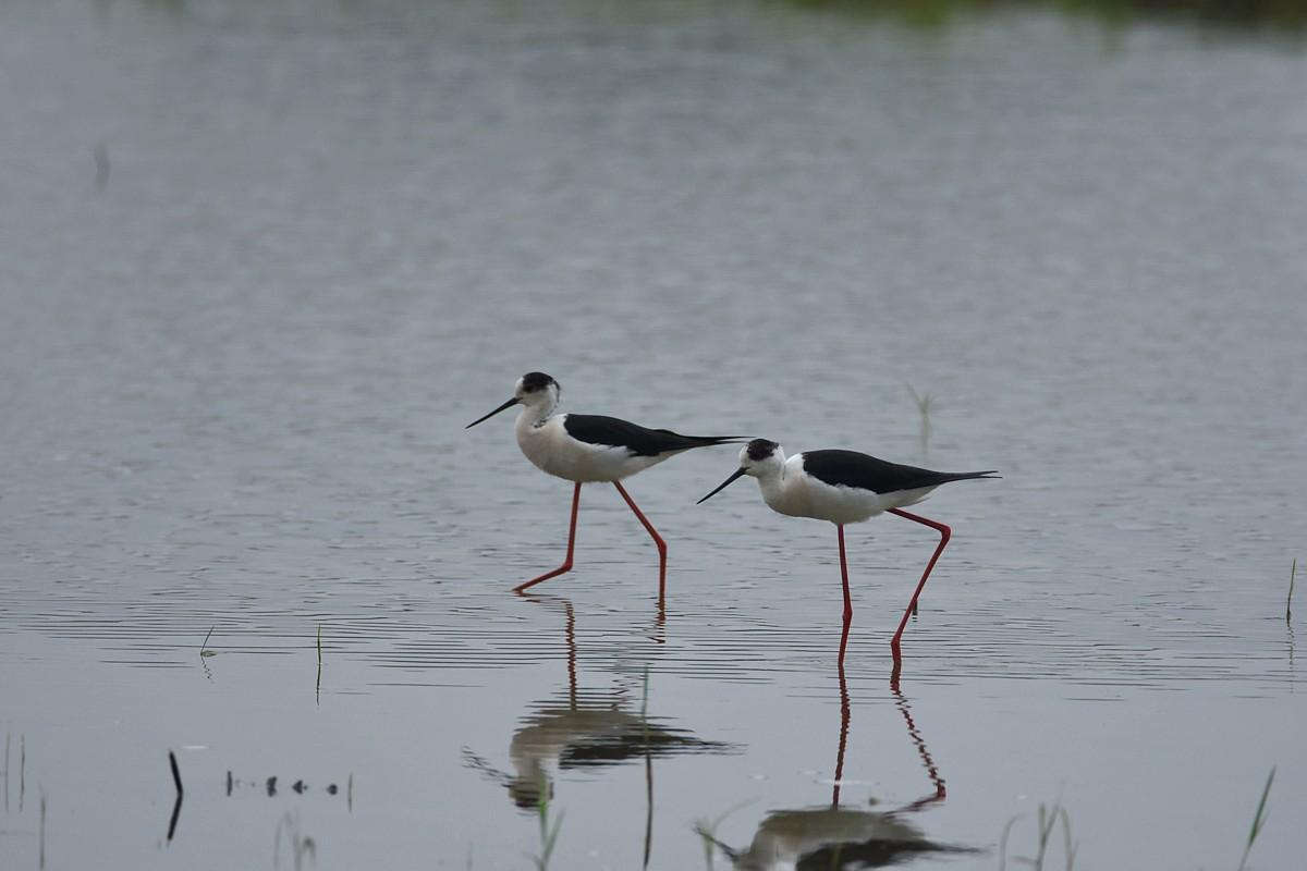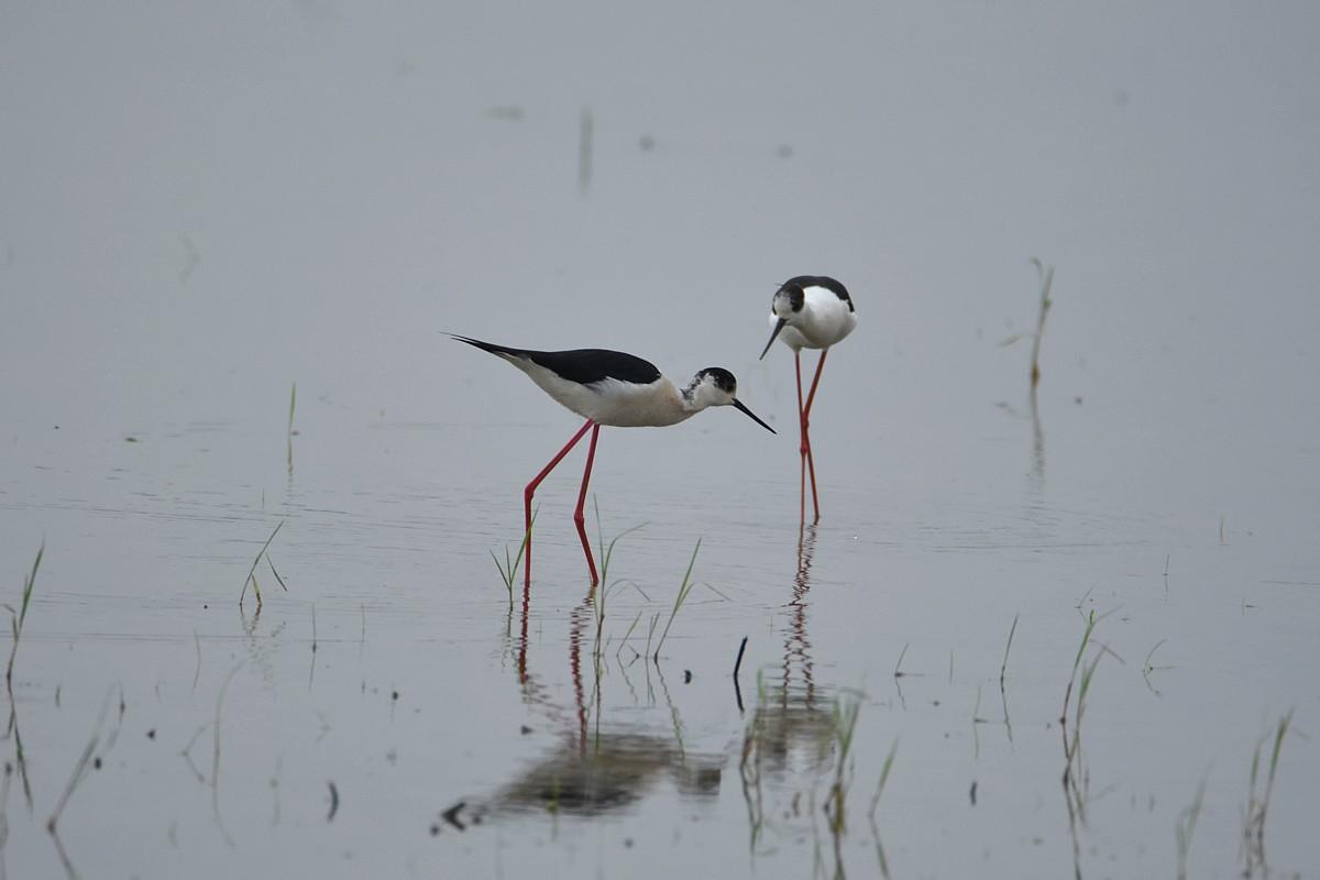 田植えの準備が整った田圃の横に、車が、2台止まっていますので、近付いて行きますと、2羽のセイタカシギが、お食事中です。