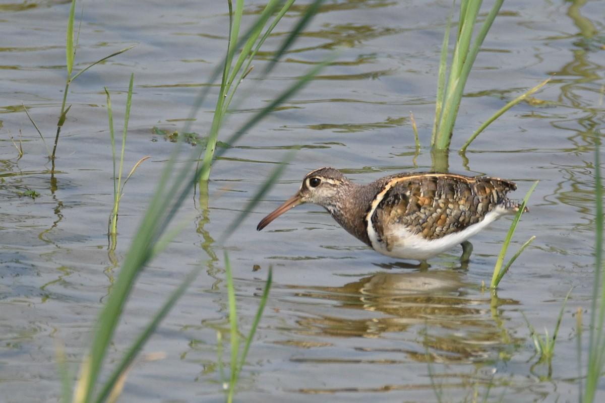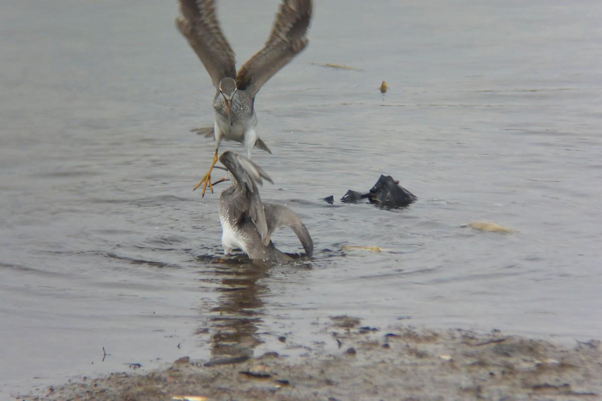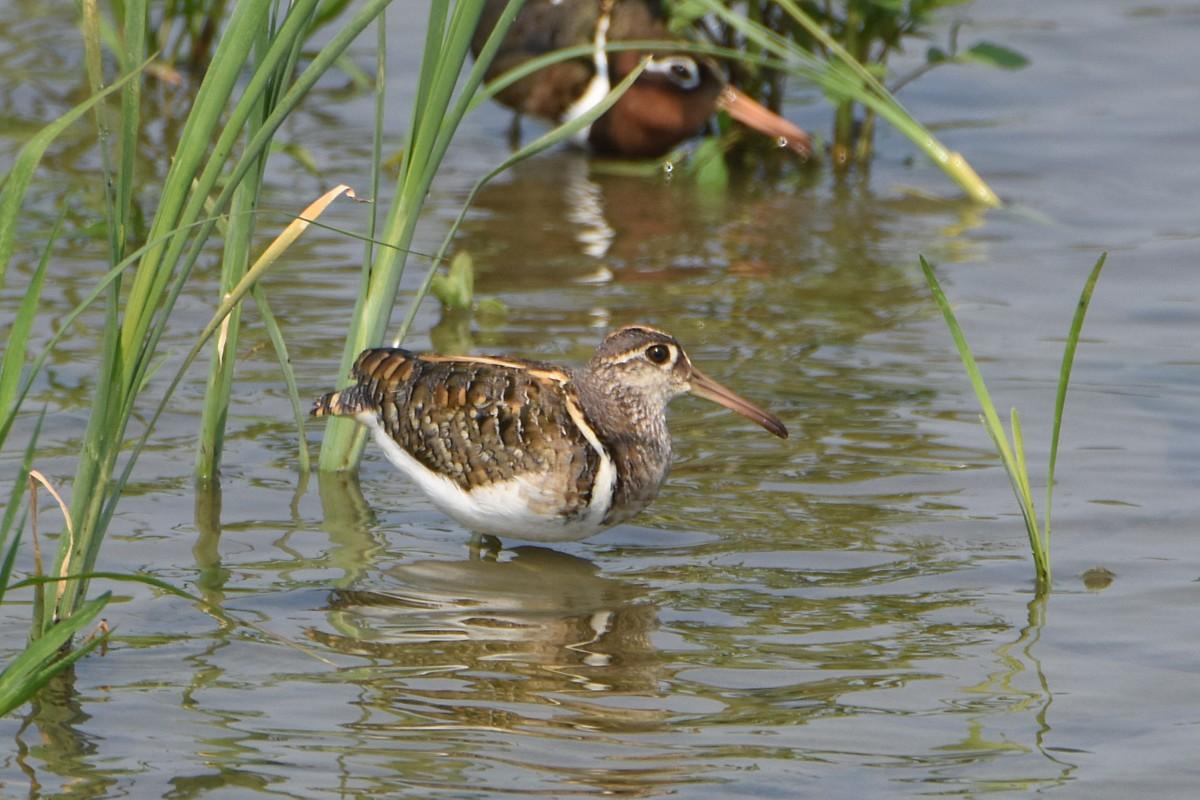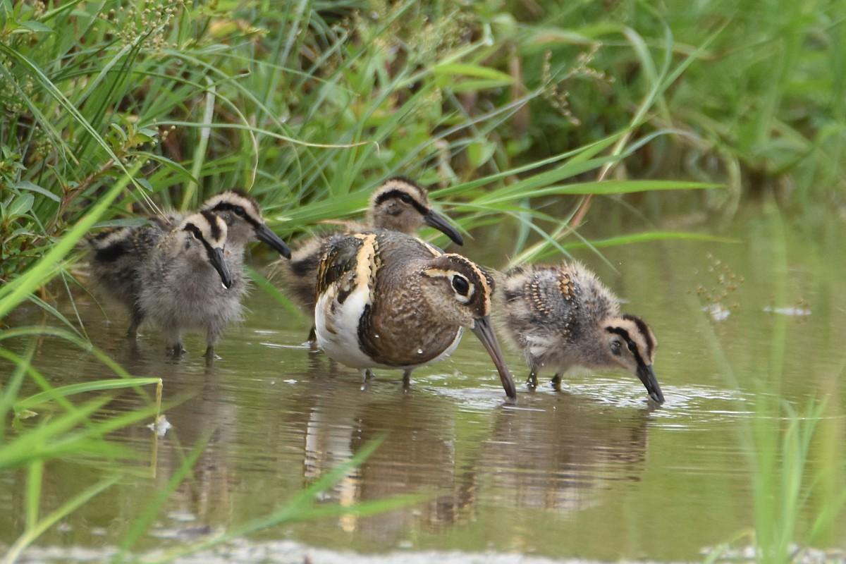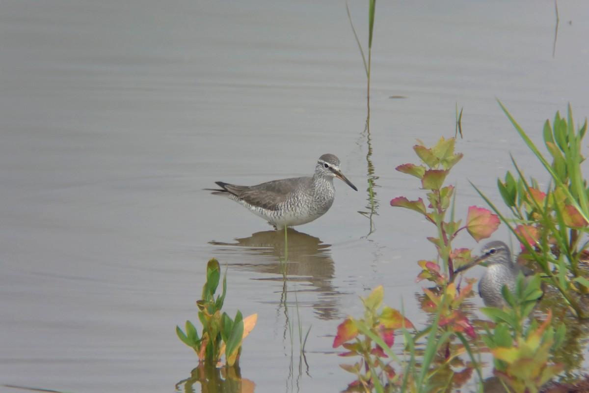 田植えの準備が整った田圃の横に、車が、2台止まっていますので、近付いて行きますと、2羽のセイタカシギが、お食事中です。