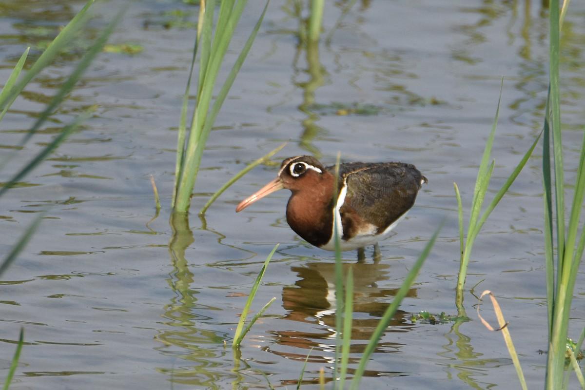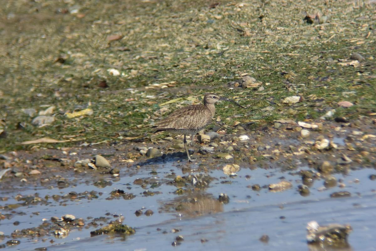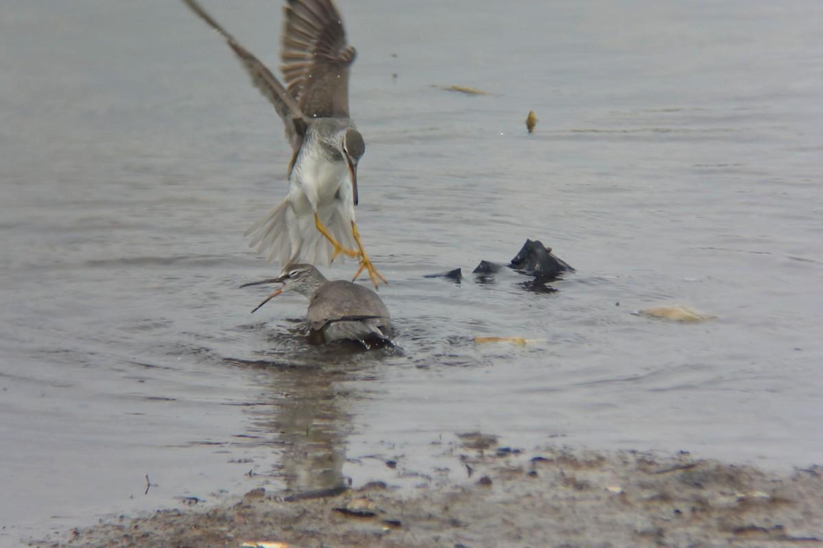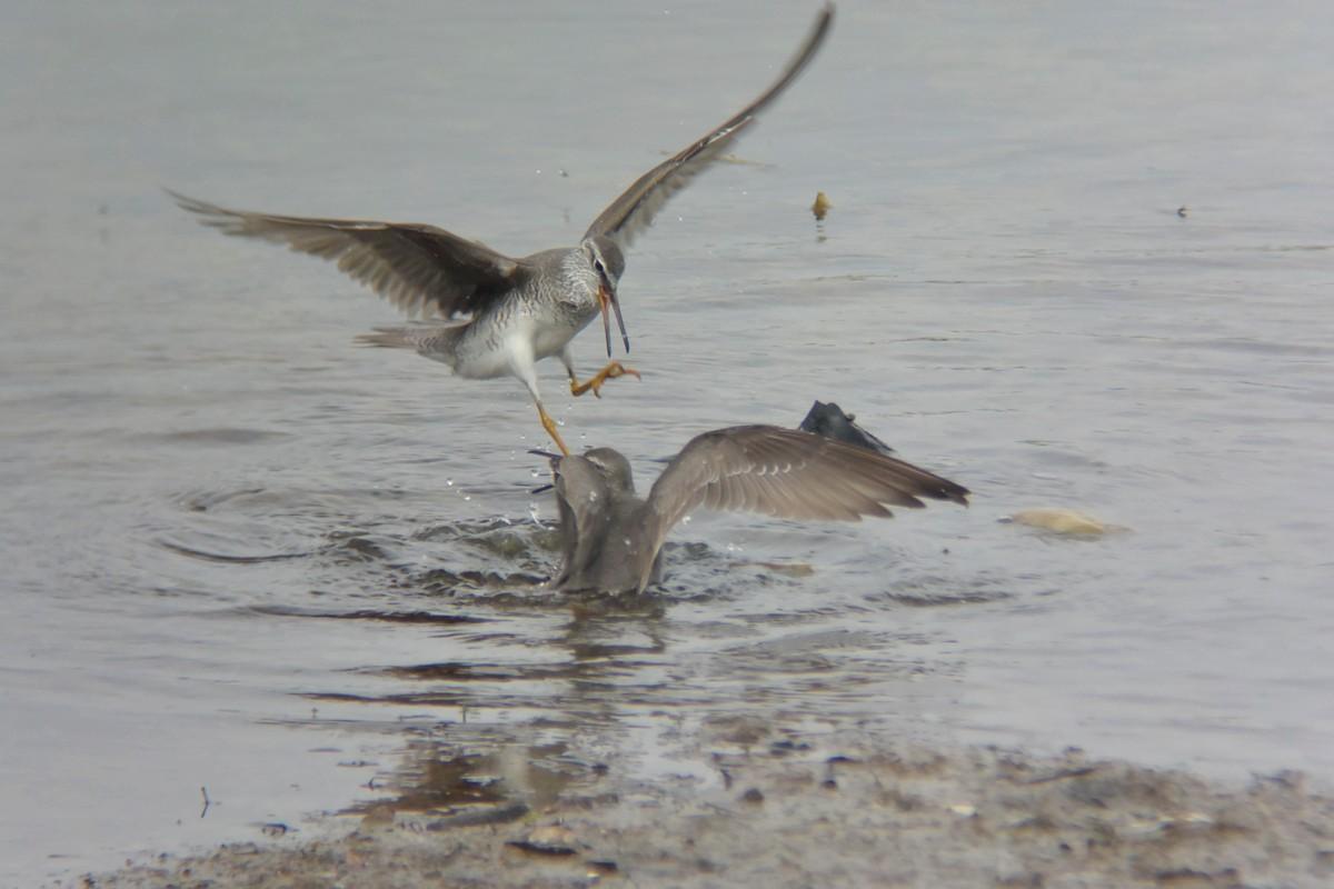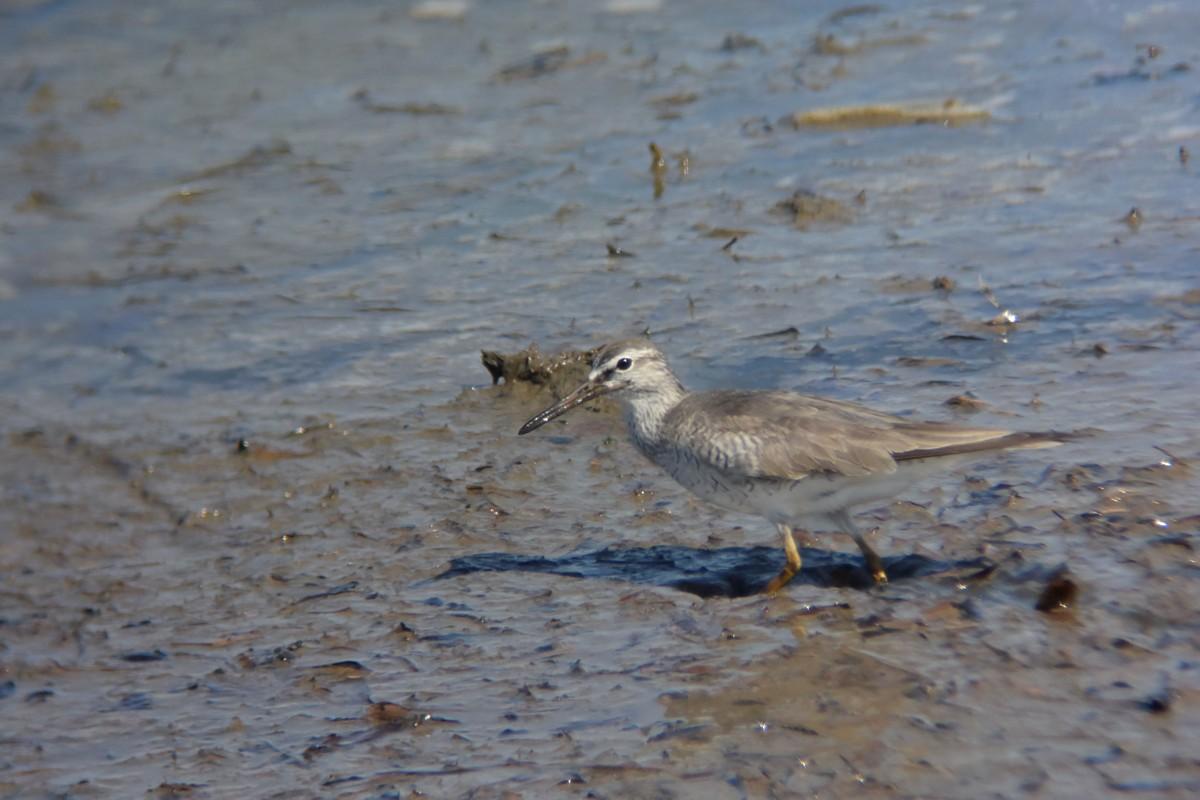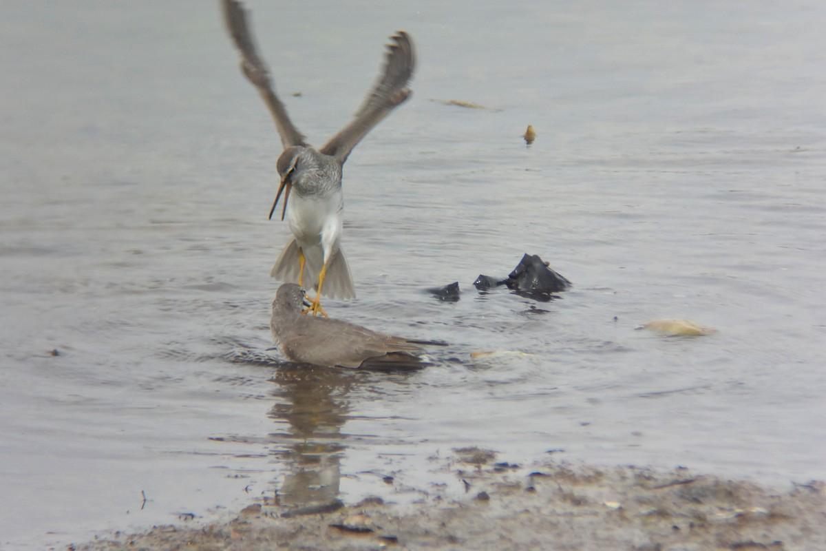 田植えの準備が整った田圃の横に、車が、2台止まっていますので、近付いて行きますと、2羽のセイタカシギが、お食事中です。