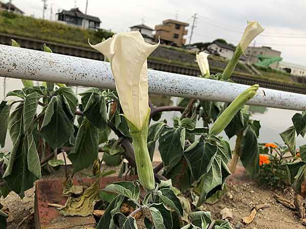 う〜ん、やっぱり調子はイマイチ?こういう時は、目線は少し外してみる・・・おっ花壇に朝鮮朝顔を発見。これっ朝しか咲かないので開花した姿見たことないんだけどね。この花の形状気になるよねぇ〜。でも、毒持ちなんだよね。口にすれば幻惑を見ちゃうらしい。怖い。
