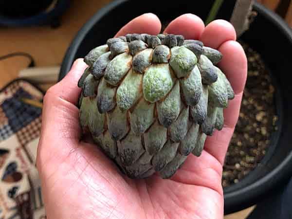今日は満を持して我が家のアテモヤを収穫だ。えっこんな時期にって思われるだろうが、もちろん自分もそう思う。でも、昨夏は単身赴任あけでバタバタ中だったので人工授粉必須のアテモヤは可哀想だけど完全にスルーしちゃったんだよね。結局、落ち着いた9月に着果。