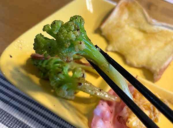 コーヒーお代わりしたら朝食だ。おぉ〜主役は間違いなく我が家産の緑カリフラワー「シチリアンイエローグリーン」だ。白いカリフラワーもいいが、緑ってより映えて悪くないものだ。特に炒めるといいよねぇ〜。もちろん、めちゃ甘〜い!