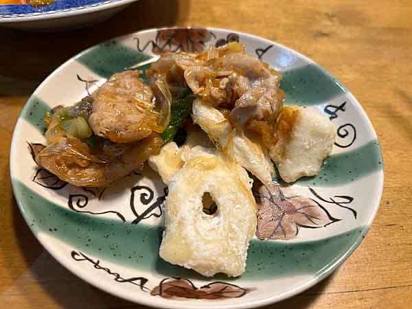続いては待ってましたちくわぶの豚肉の甘辛春雨掛けだ。カリカリに焼かれたちくわぶに豚肉、ネギ、しめじの入った甘辛タレがかかったシンプルなメニューだが、とにかくカリカリちくわぶがめちゃ美味〜い!