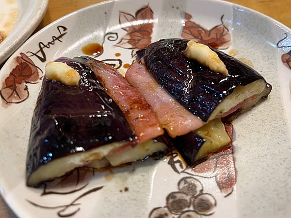 但し、もう1つのアテが更に芳ばしい香りで待ち構えている・・・茄子のベーコンはさみ焼きだよ!もう〜美味いに決まってるでしょ!だって茄子+ベーコン+生姜だよ!