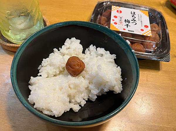 これでおしまい・・・っといきたいところだったが、あまりにも全部美味すぎてあっという間に完食してしまい、う〜ん満腹感程遠い。ダメだダメだと思いつう、炊飯器の蓋に手をかけてしまう。結局、ご飯1杯、梅干しだけで頂いちゃったよ〜。糖質制限していると白米と梅干しだけで十分。とにかく我慢しているだけに白米の美味いこと・・・あぁ〜満足。