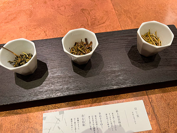 ここはカフェといっても珍しい焙じ茶専門カフェなのだ。メニューは「焙じ茶 季節の菓子付き」の1つのみ。3つのお茶の香りを確認し1つを選んで頂くというシステムなのだ。