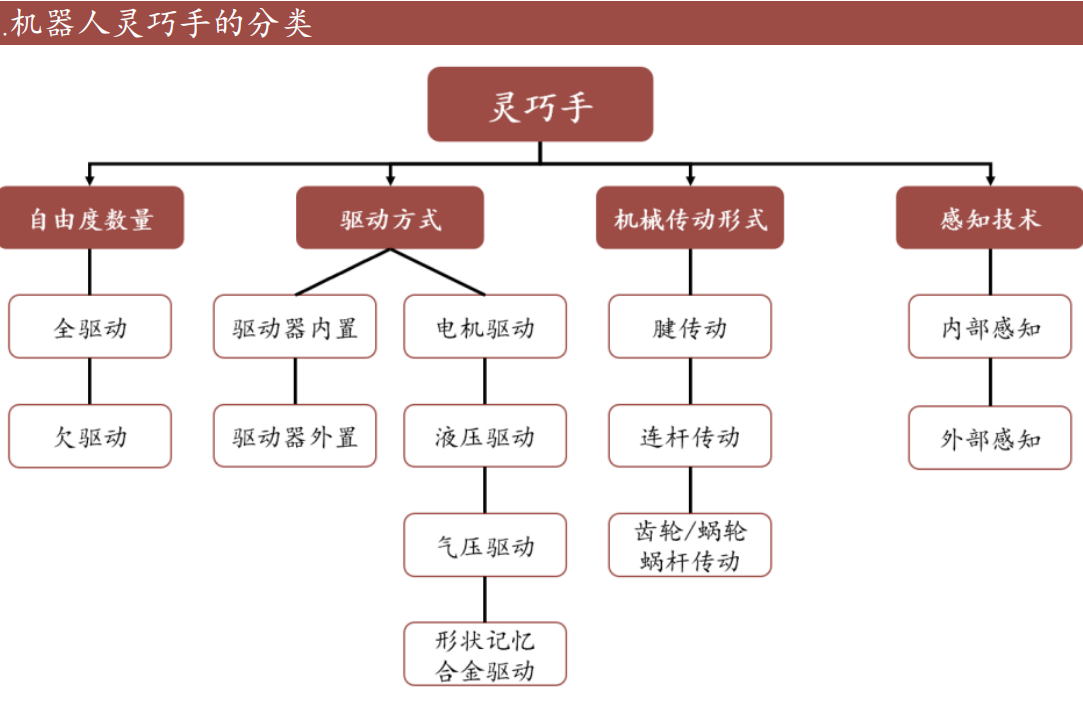 灵巧手的分类纬度有自由度数量、驱动方式、传动形式、感知形式。