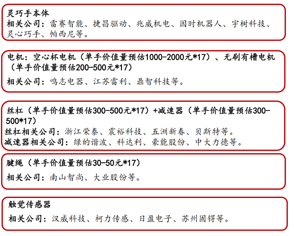 从灵巧手的产业链看,相关公司包括: