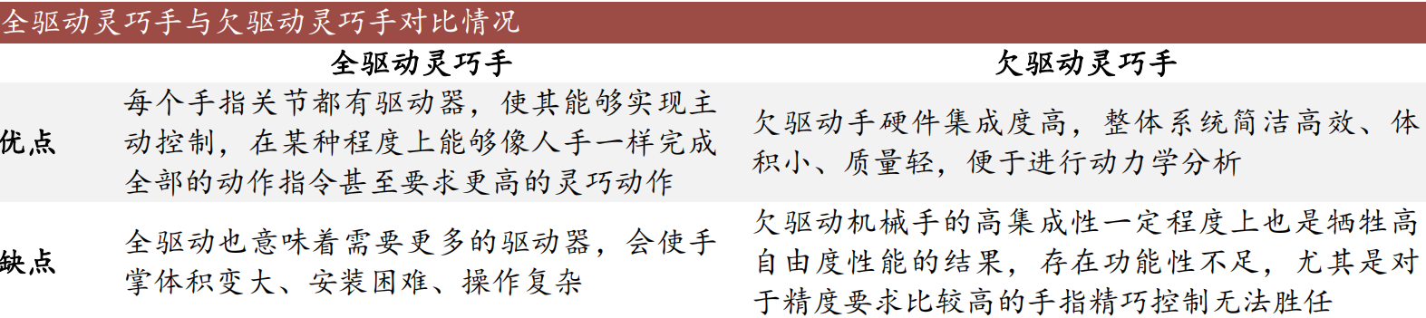 根据自由度与驱动源数量,可将灵巧手分为全驱动和欠驱动两大类。全驱动灵巧手驱动源的数量与被控制灵巧手的自由度数量相等,欠驱动灵巧手被控制的自由度多于驱动源的数目,缺少驱动源的部分则进行耦合随动。