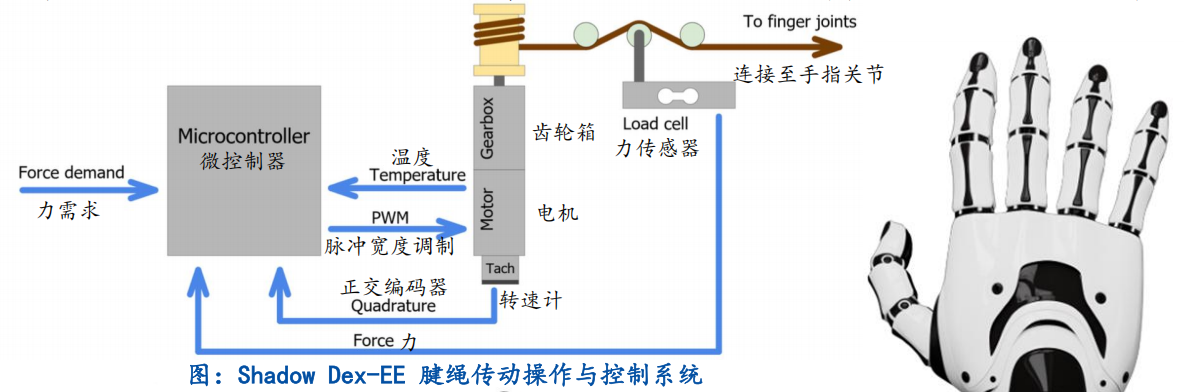 灵巧手的主要传动方式有腱传递、连杆传动和齿轮/蜗轮蜗杆传动。线绳驱动是目前灵巧手研究中应用最为广泛的一种传动方式;齿轮/蜗轮蜗杆传动在工业机器人中应用比较广泛;连杆传动多用于工业和商业用途,多个连杆串并联混合的使用形式较为常见。