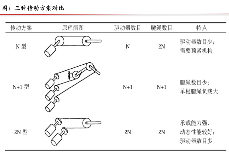 目前,主流的腱绳传动方案有三种:N型、N+1型、2N型。其中,N、N+1、2N分别代表驱动N个独立自由度所需的驱动单元数目。