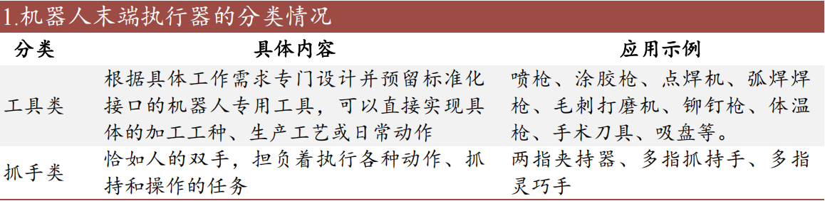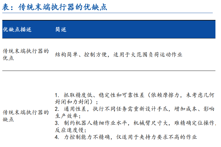 传统的末端执行器是功能单一、为特定任务而设计的工具,比如平行二指夹爪、真空或磁性吸盘、焊枪、喷枪、抛光轮等等单一工具。传统末端执行器结构简单、便于控制、适用于大范围负荷运动作业等优点,现今在一些特定领域仍然有很大需求,但是也存在通用性差、精度不足、可靠性欠缺等一系列缺点。