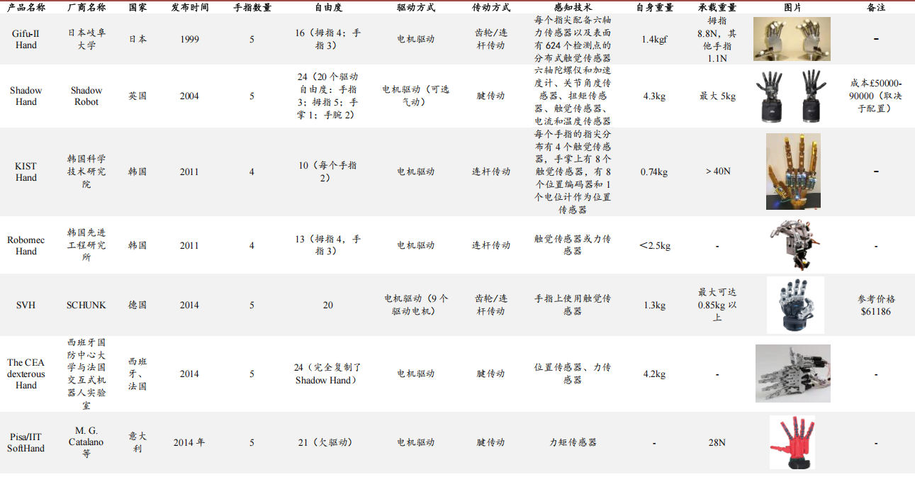 国外灵巧手产品对比: