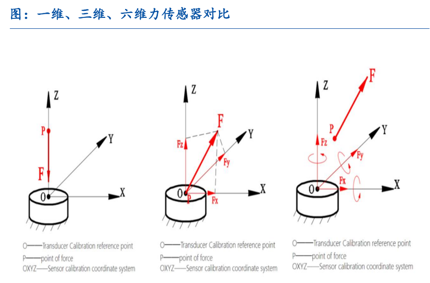 力/力矩传感器:力/扭矩传感器提供机械手的动态信息,动态信息是机械手进行稳定的灵巧抓取和操作的必要条件。因此,力/扭矩传感器对于与未知物体进行交互至关重要,无论在操作安全性还是自主性方面都是如此。对于机械手和机器人手而言,关节处通常都配备有关节扭矩传感器。力/力矩传感器是一种能感知力、力矩并转换成可用输出信号的传感器,核心原理是将力作用下的形变转换成电信号,当有力/力矩作用时,力/力矩施加于传感器本体单元上,并引起本体单元的应变或形变,检测系统感知本体的应变或形变,通过电路将其转化为相应电压,通过测量电压值来表征力/力矩大小,并转换成可用输出信号,实现力/力矩的测量。人形机器人关节处使用单维力传感器,执行器末端主要使用六维力传感器,目前国内厂商主要处于提高测量精度及降本阶段。