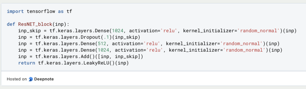 In diesem Fall durchläuft der Input erst eine Dense-Layer mit 1024 Neuronen. Anschließend folgt ein Block bestehend aus einer Dropout-Layer und zwei Dense-Layer, die die Zahl der Neuronen erst auf 512 beschränkt, bevor es wieder auf 1024 erhöht wird. Dann erfolgt die Zusammenführung mit der Add-Layer. Da beide Inputs eine Dimensionalität von 1024 haben, lassen sie sich ohne Probleme aufaddieren.