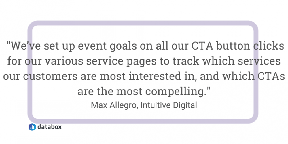 Max Allegro of Intuitive Digital adds, “Event goals are excellent for tracking user behavior on a specific page or throughout a website. We’ve set up event goals on all our CTA button clicks for our various service pages to track which services our customers are most interested in, and which CTAs are the most compelling. We use these goals as benchmarks for changing up the text in our buttons and surrounding CTA copy, and to experiment with what brings in more clicks.”