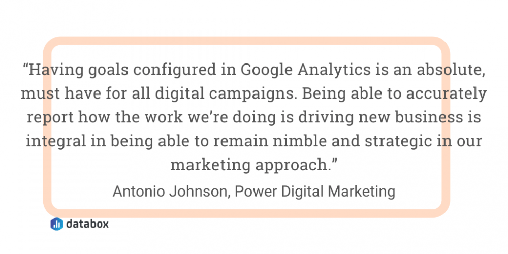 Antonio Johnson of Power Digital Marketing adds, “Having goals configured in Google Analytics is an absolute must-have for all digital campaigns. Being able to accurately report how the work we’re doing is driving new business is integral in being able to remain nimble and strategic in our marketing approach. Whether its understanding form fills, the sales funnel, or eCommerce transactions, setting up goals for all of these touch points is a requirement to optimize marketing campaigns properly.”