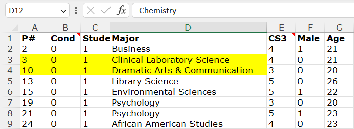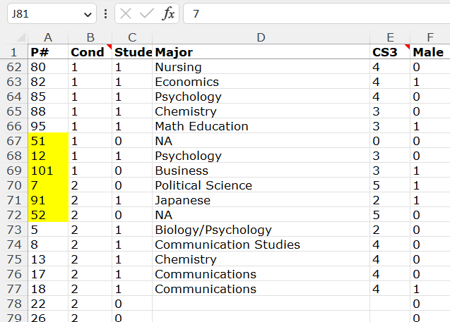 Additionally, notice that rows 3 and 4 have participant IDs #3 and #10. Row 70, remember, has ID #7, so it used to be, before it was moved by hand, in exactly the expected position (between 3 and 10) if (1) that observation was originally in Condition 0, and (2) the spreadsheet was sorted by condition and ID, as it is.