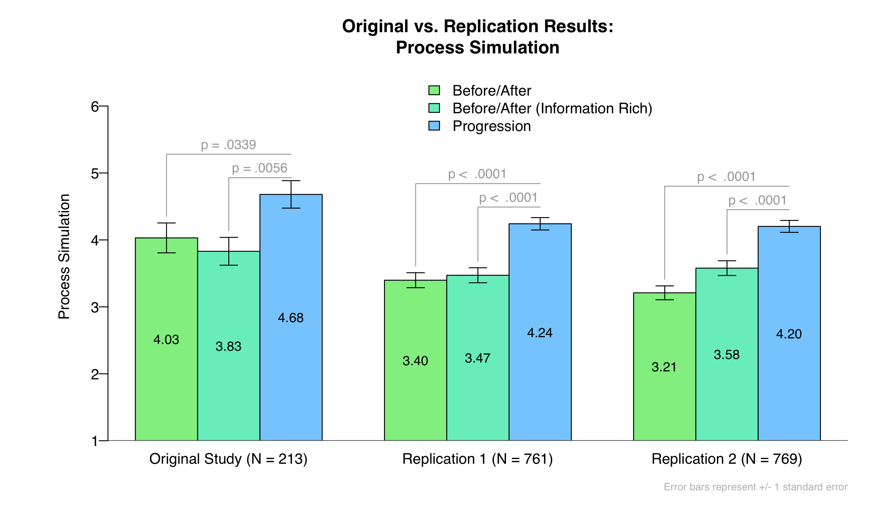 First, we find highly significant evidence that participants judged the Progression ad to be more credible than the simple Before/After ad. Our effect sizes are also similar. Whereas the original authors found d = .51, we found d = .32 and d = .49 in our first and second replications, respectively.