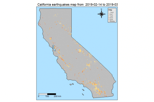p <- p + tm_layout(main.title = paste("California earthquakes map from ", paste(as.Date(df_map_inner_join$time[1]), as.Date(df_map_inner_join$time[nrow(df_map_inner_join)]), sep = " to ")))