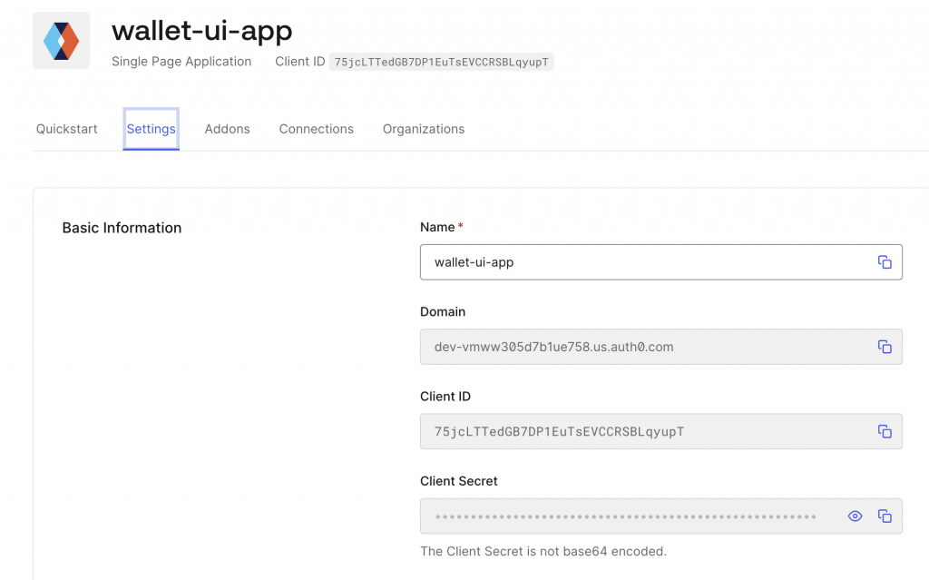 On the newly created app, go to the Settings tab and grab the domain and the client ID: