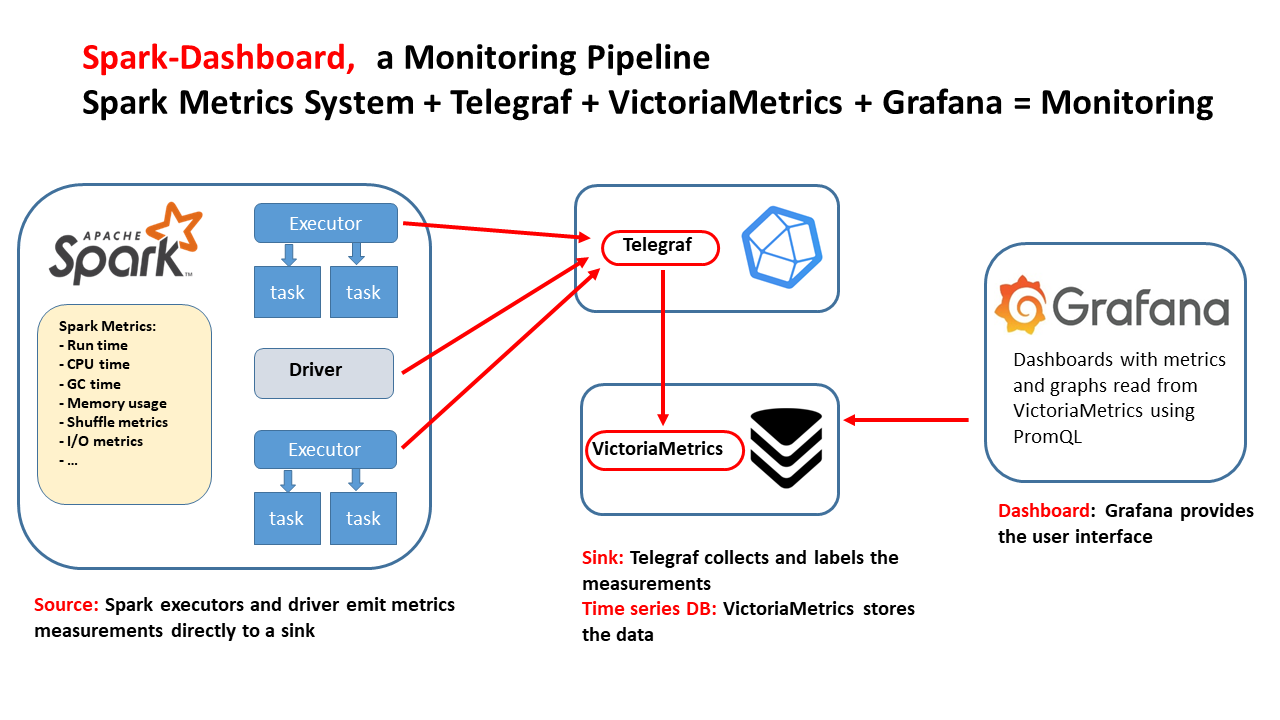 - Spark-Dashboard: This application aggregates metrics that Spark exposes through the Dropwizard metrics library (see Spark-Dashboard architecture). A complete list of the metrics can be found here.