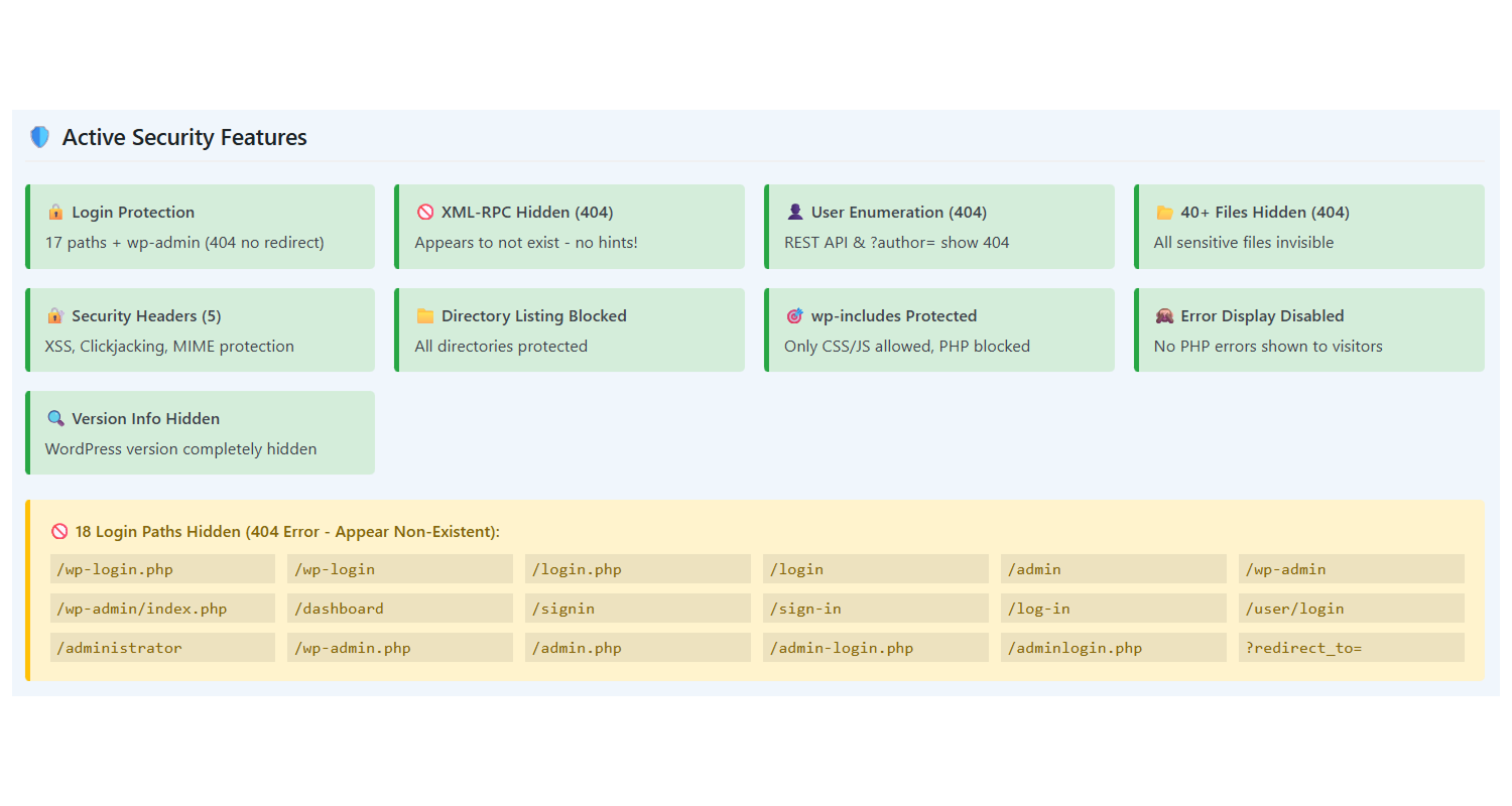 - Changed wp-admin behavior – shows 404 instead of redirect when logged out
