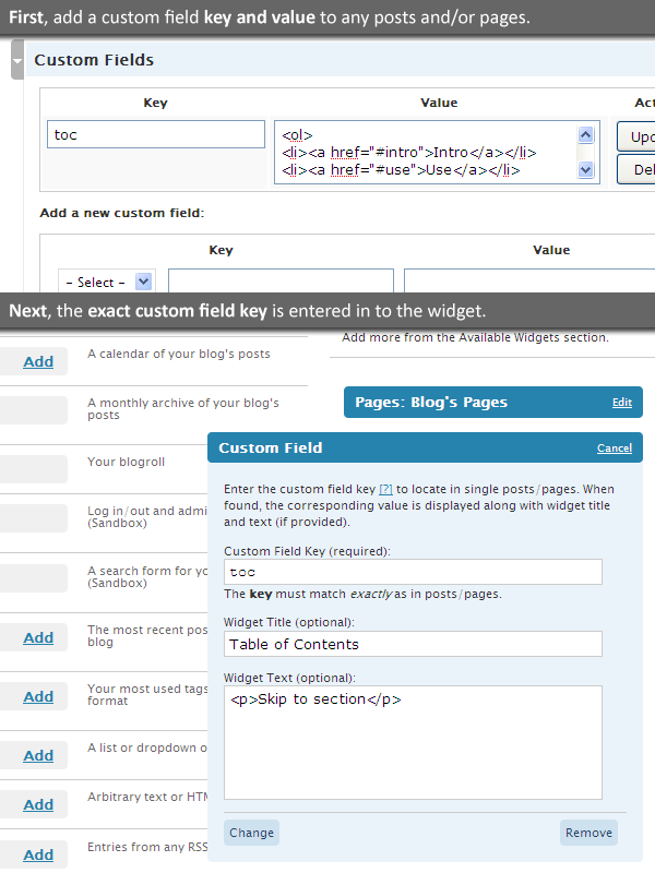 Because each table of contents (a short ol of items) varied from page to page, it also had to be specific to each page. So I created a custom field key of toc and added the ol of items to its value. Enabling the plugin, I had a table of contents appear in the sidebar for each page with a custom field key of toc.