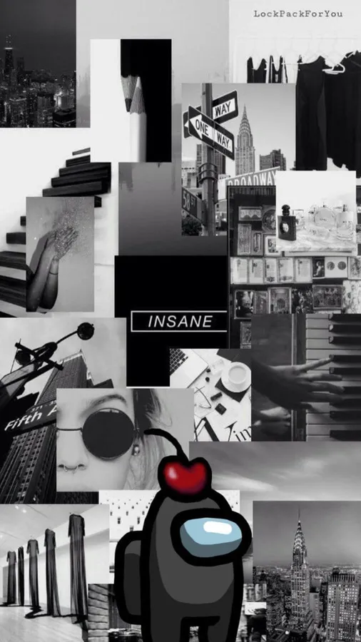 Der Schwarze Crewkollege Von Among Us Trägt Eine Kirsche Auf Dem Kopf, Während Er Vor Einer Schwarz-weiß-collage Auftritt.