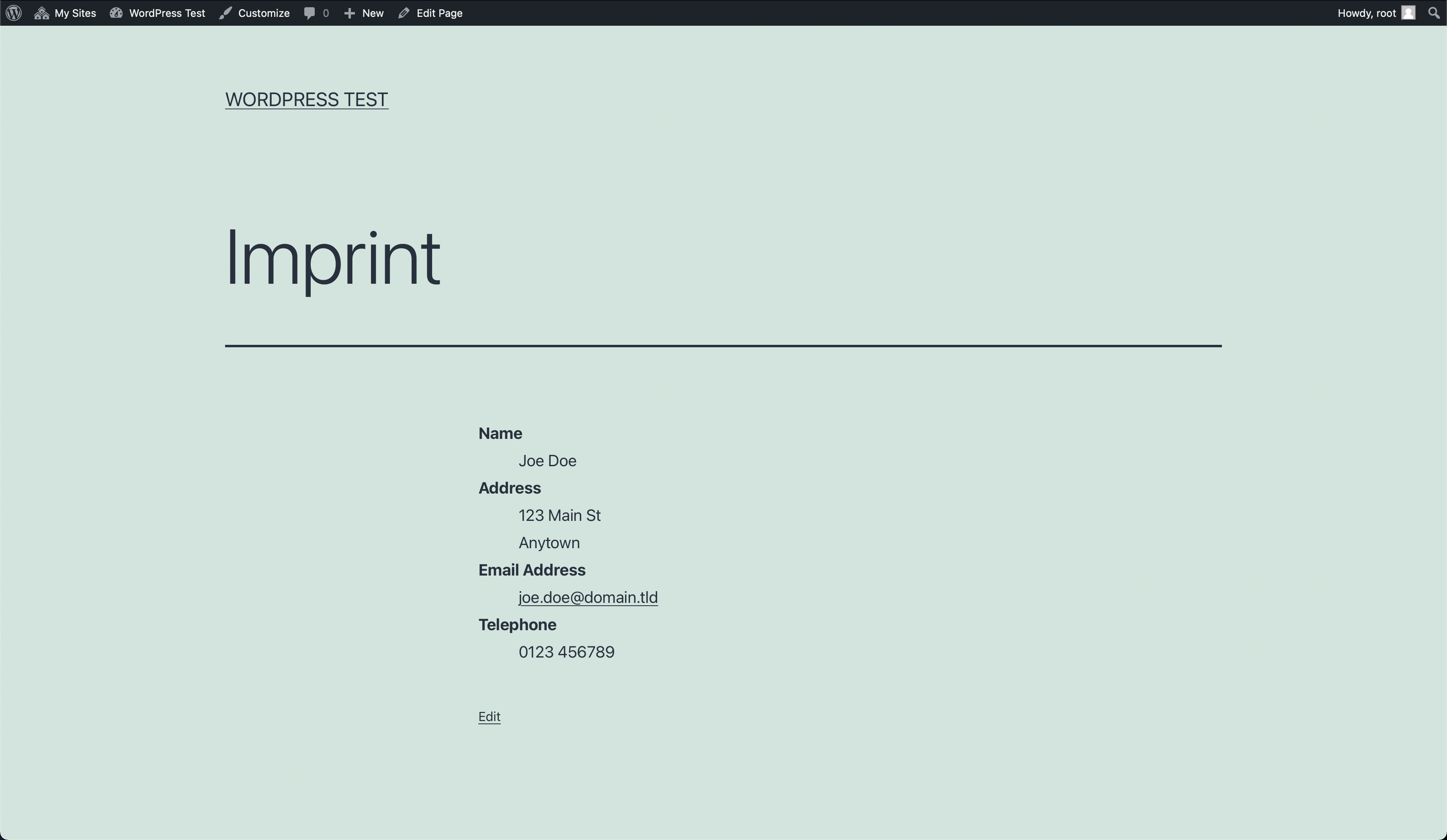 Durch das Hinzufügen des „Impressum“-Blocks irgendwo auf deine Website kannst du wählen, wo dein Impressum ausgegeben werden soll. Alternativ kannst du den Shortcode