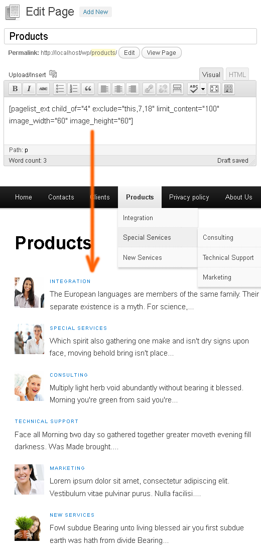[pagelist_ext limit_content="100"]; by default: limit_content=“250″; - image_width – width of the image