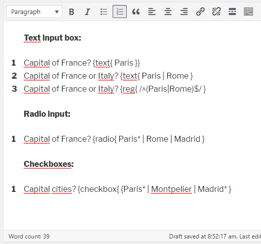 <li>The capital of France is ...? {itext{ Paris }}</li>