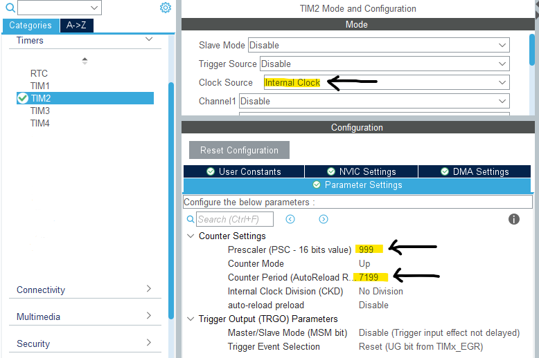 As we’ve calculated earlier, the Prescaler will be 999, and the Preload value will be 7199. And the timer module will be clocked at the internal clock frequency.
