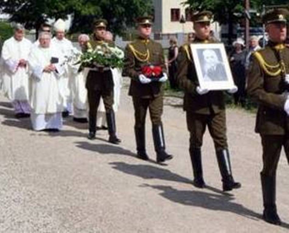 Remains of 1941 fascist leader Juozas Ambrazevičius (Brazaitis) met by honor guard at Vilnius Airport on 17 May 2012 and reburied in Kaunas’s Church of the Resurrection on the 20th, as city’s mayor dismisses criticism.