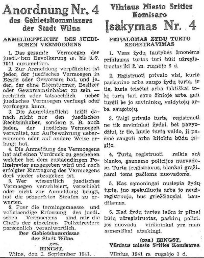 The abrupt murder of eight thousand citizens leads to stacks of ownerless property in town. The Gestapo rapidly followed up with this public order (Nr. 4 on 1 Sept. 1941), this time in German and Lithuanian, ordering the ‘registration’ of the abandoned Jewish property in Vilna. Image from Leyzer Ran, Jerusalem of Lithuania, NY 1974, vol. II, p. 432). By permission of Professor Faye Ran (NY).