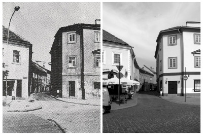 We are at the corner of Didžioji (Yiddish Breyte gas; ‘Broad Street’) and the narrow winding Stiklių Street (Yiddish Glezer gesl; ‘Glazier Street’). In fact, the gate to the ghetto was affixed right to this building’s wall. The angle in the wall marks the spot. The people outside the gate were free. Those on the inside were slated for genocide because they were Jewish. But this ‘detail’ is not mentioned on the building of this research center dedicated to — genocide in Lithuania. The precise spot is visible on the Yiddish map from Vilna Ghetto times, where the thick black line is the ghetto boundary. Most of the building (lower right hand corner of the map) borders the last yards of free Vilna at this gate, with the final portion, from the kink in the wall to the end, flush against the start of the Vilna Ghetto area. Below it, a zoom-in of the building itself.