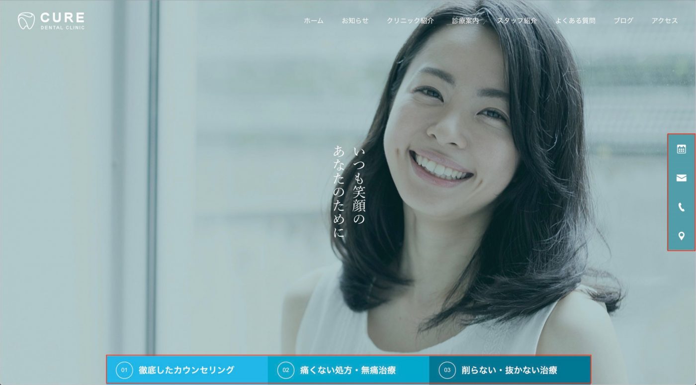 CUREで最初に目に入る特徴的な点は、固定表示されるサイドバーメニューとヘッダーコンテンツ下部の3点ボックスです。これらは医院のウェブサイト構築する上で必要不可欠な、来院を考えているユーザーの心配や不安を取り除く項目をセットできる機能といえます。