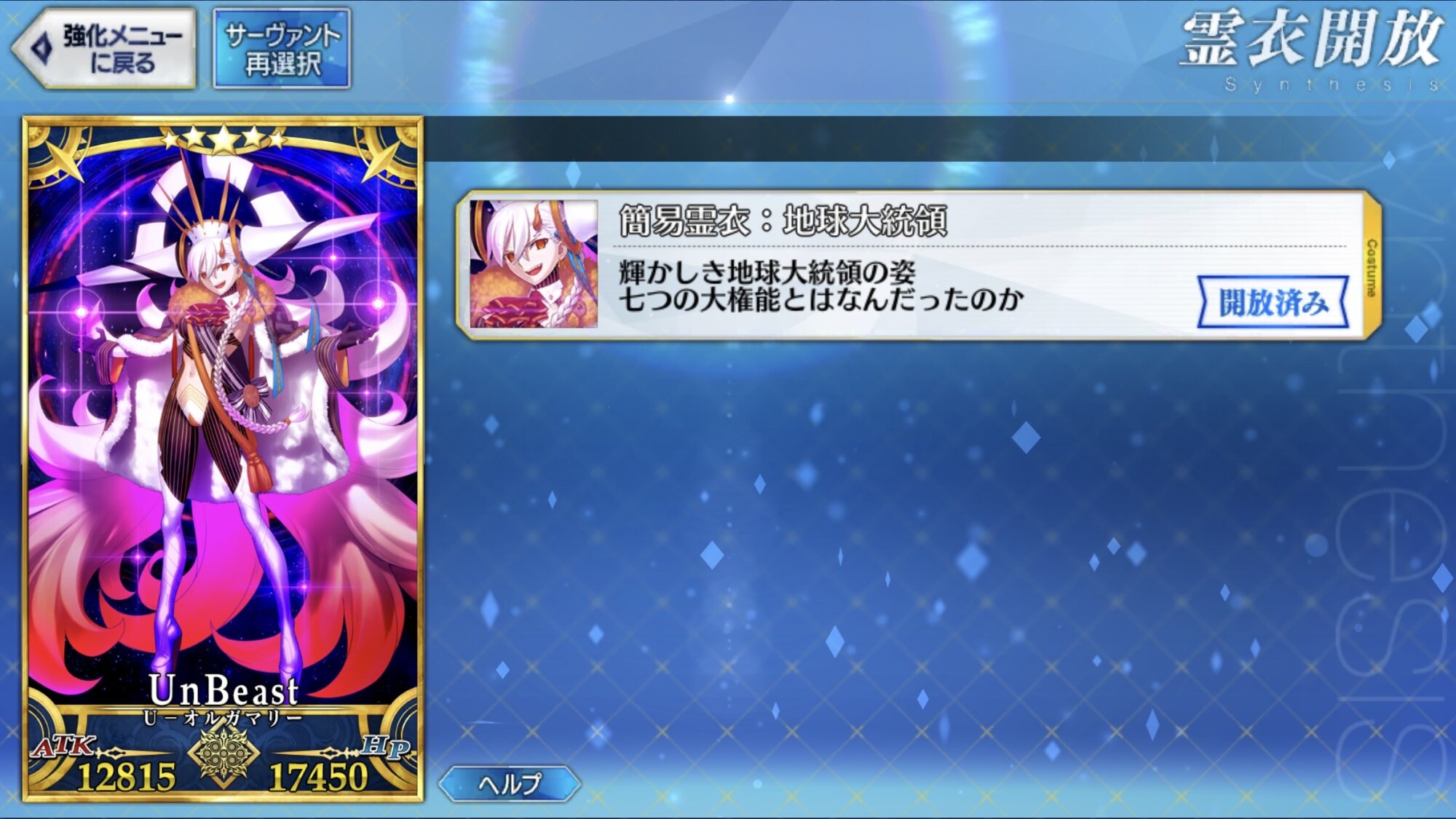 本日開幕の『???』をクリアすることで、「★5(SSR)U-オルガマリー」の簡易霊衣「地球大統領」の開放権が、ダ・ヴィンチ工房の「霊衣縫製」に恒常的に追加!