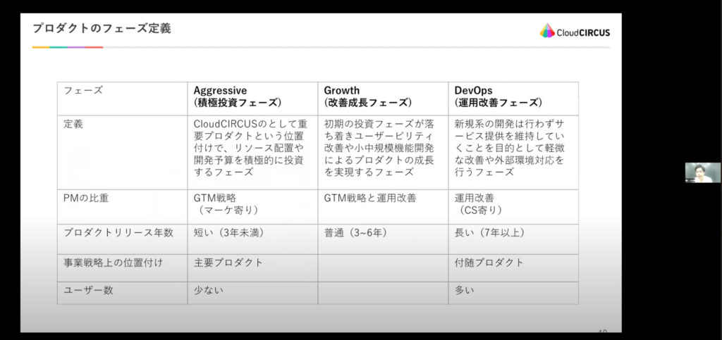 色々なプロダクトがあるなかで、「事業サイクルとハイプサイクルにより、プロダクトの役割は変わる」とお話された橋口さん。市場でどの程度流行っているか、廃れているかによりプロダクト自体の役割は変わります。プロダクトごとに、いつ盛り上がり、いつ運用にはいるか見極める必要があります。クラウドサーカス株式会社では、プロダクトごとにどのフェーズにいるのかを確認し、PMの比重を見極めているとのこと。プロダクトが複数あるからこそ、事業戦略上の位置付けをしっかりとされているんだなというのが印象的でした。