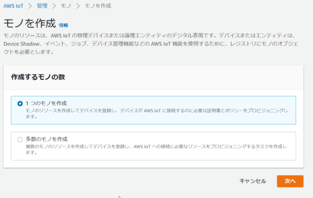 モノを作成の画面に遷移しますので、デフォルトの「1つのモノを作成」のまま次へ