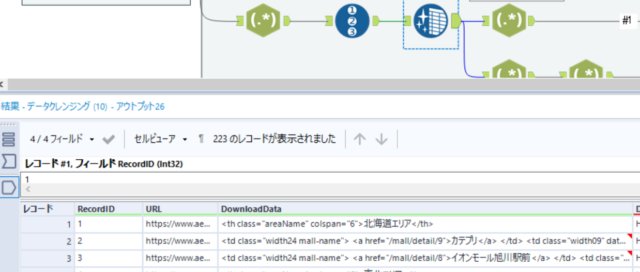 レコードIDツールで店舗ごとに連番のIDを割り振り、後から加工しやすいようにデータクレンジングツールで改行や空白を削除します。ここでの処理のポイントとして、割り振っておいた店舗ごとのIDが後から活躍します。