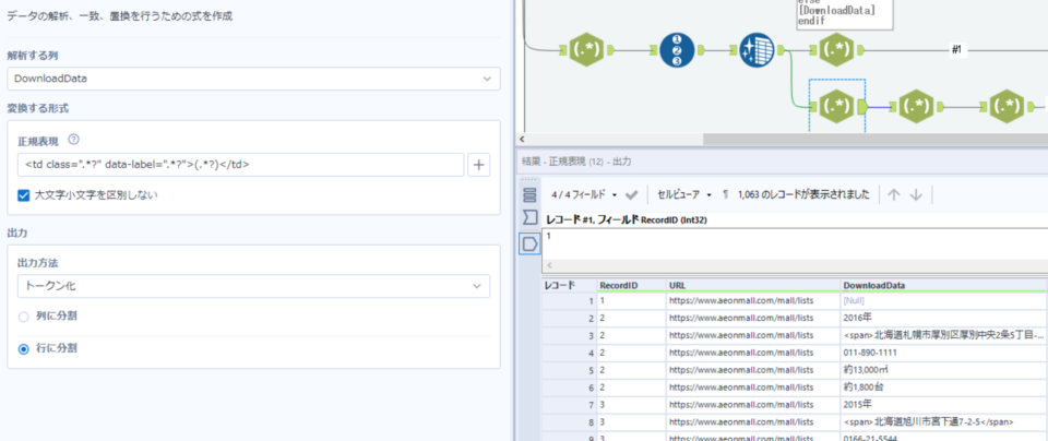 店舗名以外のデータ取得は以下の通り。店舗名とは異なり、spanタグやbrタグが使われているため、適宜正規表現で空文字に置換しておきます。ユニオンツールで店舗名とそれ以外のデータを結合できるようになりました。