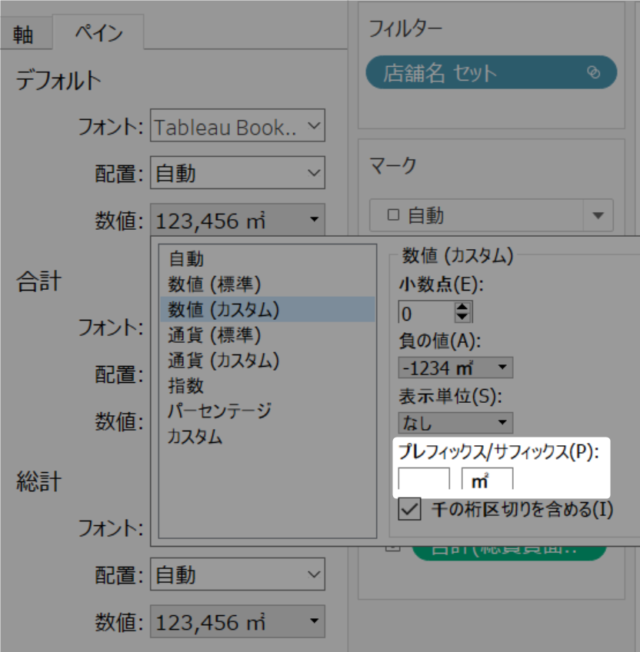 ラベルとして総賃貸面積を指定し、書式設定からサフィックスに「㎡」を設定することで単位が表示されるようにしました。